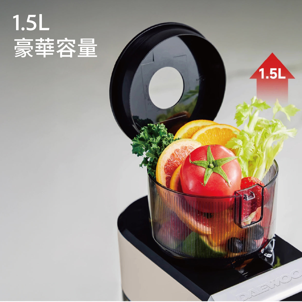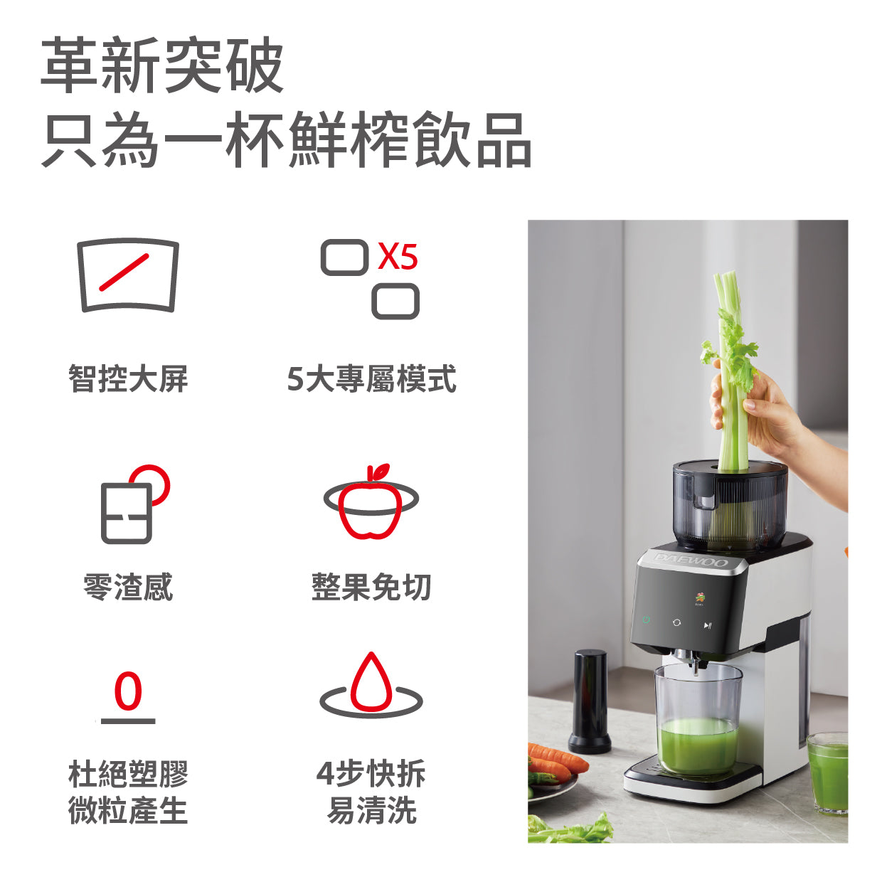DAEWOO's new generation DY-BM11 PRO color-visual variable frequency juicer is equipped with a "smart touch-control large color screen" and a "120N variable frequency DC motor". It has five modes to choose from with one button, and the speed is automatically adjusted. It also has a "130mm large diameter + 1500ml large capacity" design for direct injection without cutting, and zero residue in the juice. It is made of food-grade materials to eliminate plastic particles, making every bite pure and safe! It takes care of you from early morning to afternoon. One machine meets the needs of the whole family. It is quick to disassemble and easy to clean, and your healthy life will be easily upgraded from now on!