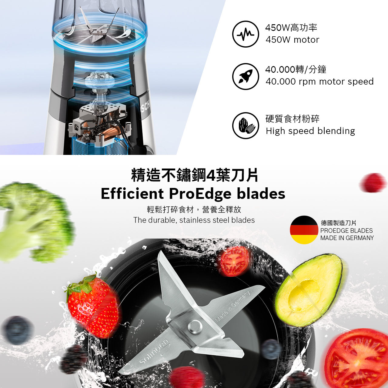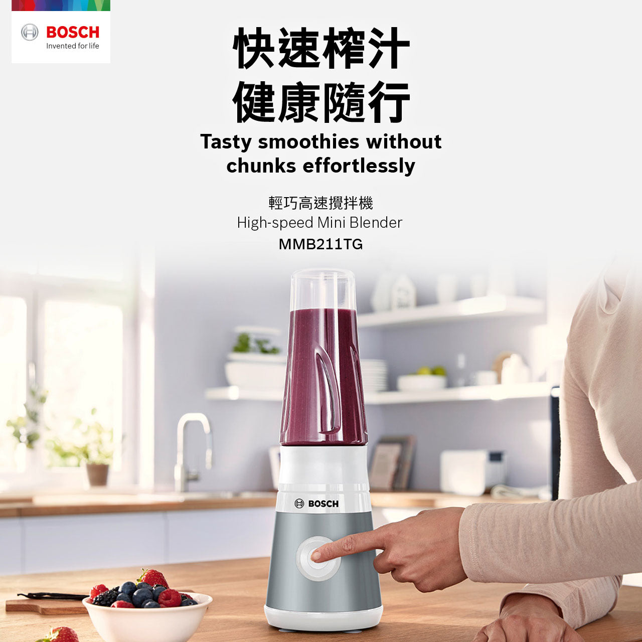 Bosch VitaPower Series 2 mini blender. The compact and powerful 450W mini blender with leak-proof Tritan ToGo-bottle. Enjoy healthy smoothies without chunks. Made in Europe.
