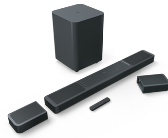 Immerse yourself in theater-quality 3D sound. With four up-firing drivers in the main bar and two more in the detachable speakers, the JBL Bar 1300X delivers true Dolby Atmos® and DTS:X together with MultiBeam™ for an enhanced 3D surround sound experience.