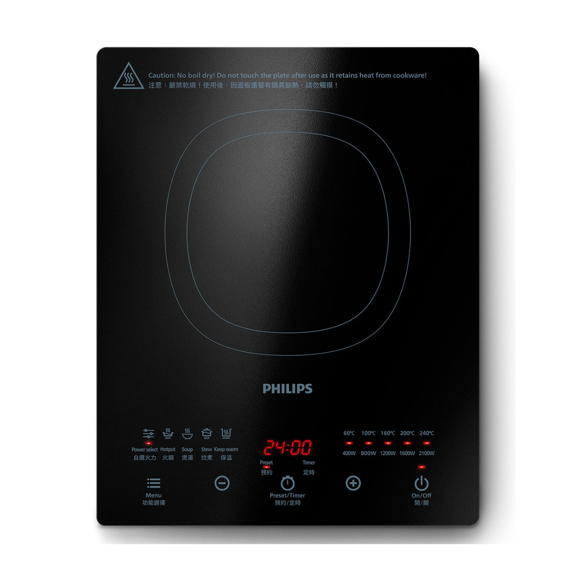 Thanks to 2100W high power, the Philips Induction cooker ensures fast and efficient heating, which helps cookware bottom to reach high temperature instantly. Totally 5 local relevant menus provides a variety of choice for contemporary cook.