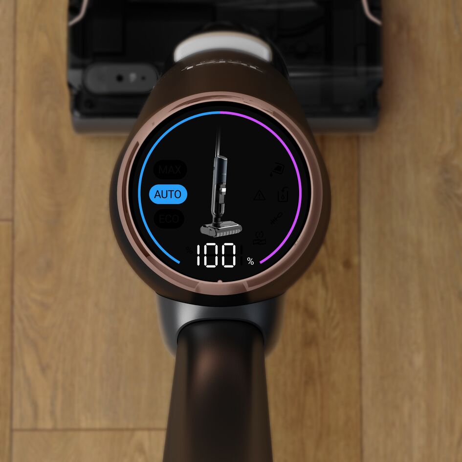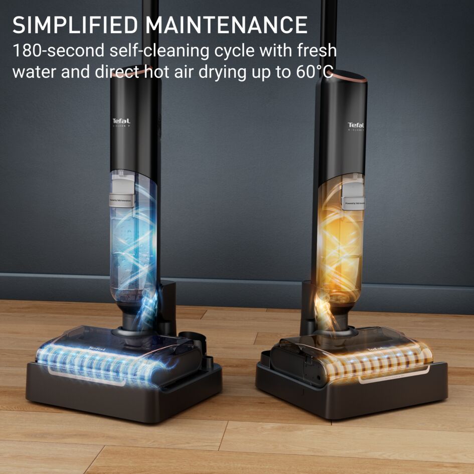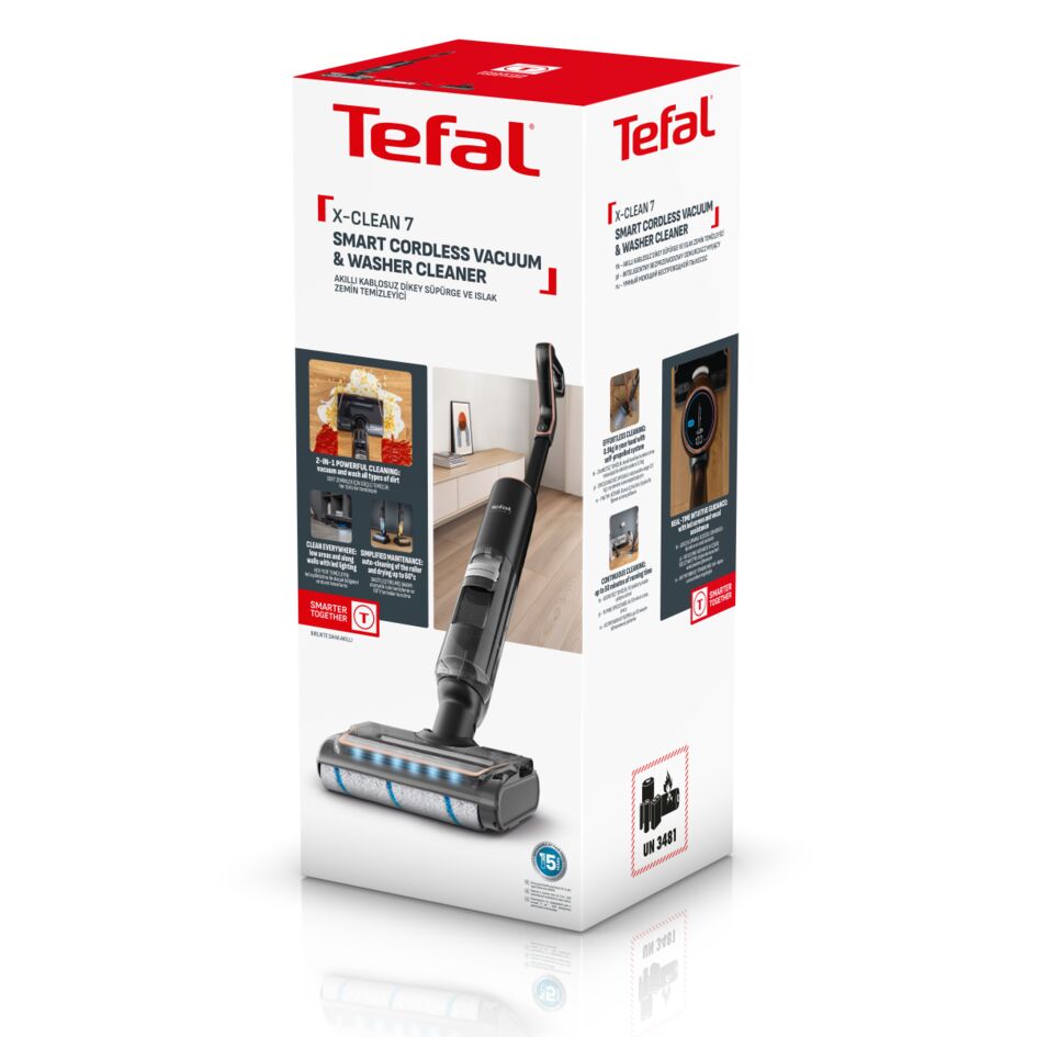 Tefal X-Clean 7 Wet and Dry Vacuum Mop offers powerful 2-in-1 cleaning with auto dirt detection. Its 180° lay-flat design and LED lights clean under furniture. The self-propelled roller weighs only 0.9 kg for easy use. Features self-cleaning, 60°C hot air drying, 50-min runtime, and a 650 ml tank. Anti-tangle system and voice guidance ensure effortless maintenance.