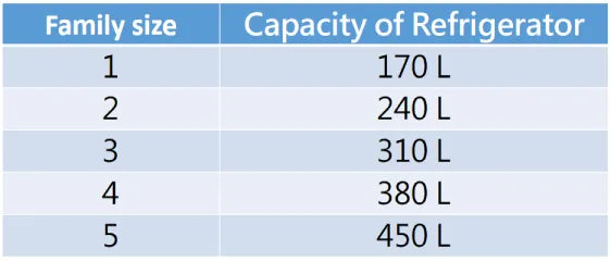 Capacity of Refrigerator = (Required capacity for each family member 70 liters X number of households) + 100 liters of basic supplies